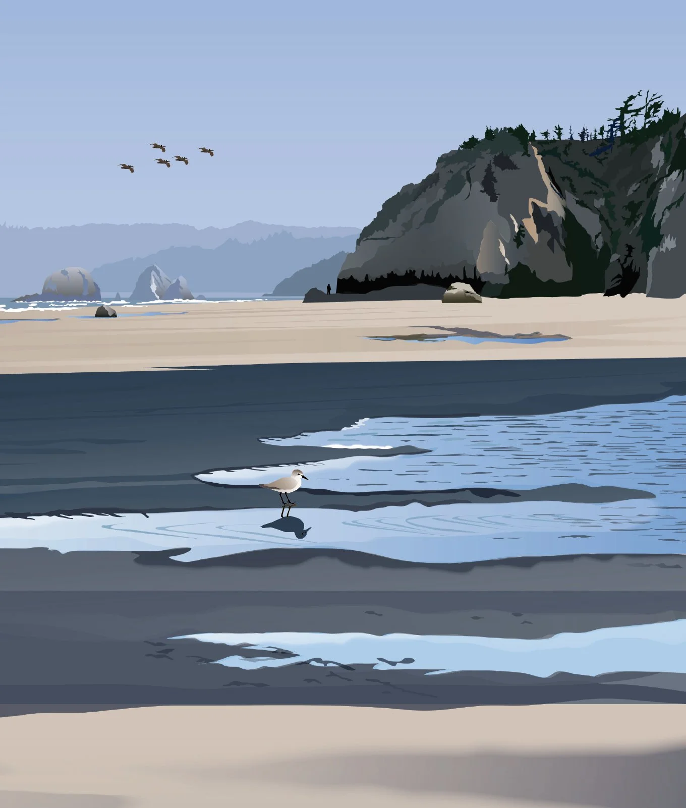 This little sandy cove beach is under water when the tide is high. Lots of little inland seas are left behind as the water recedes, so it’s good for tide pooling. In the background is Haystack Rock at Cannon Beach, you can walk there when the tide is this low. Look closely and note the tiny figure in the middle of the drawing standing on the rocks. He’s walking along the old stagecoach road. Before the highway was built this was the route north and south along the coast! You can still see the ruts carved into the rock. Pioneers traveling along the “road” had to “hug” the headland carefully, thus the name.